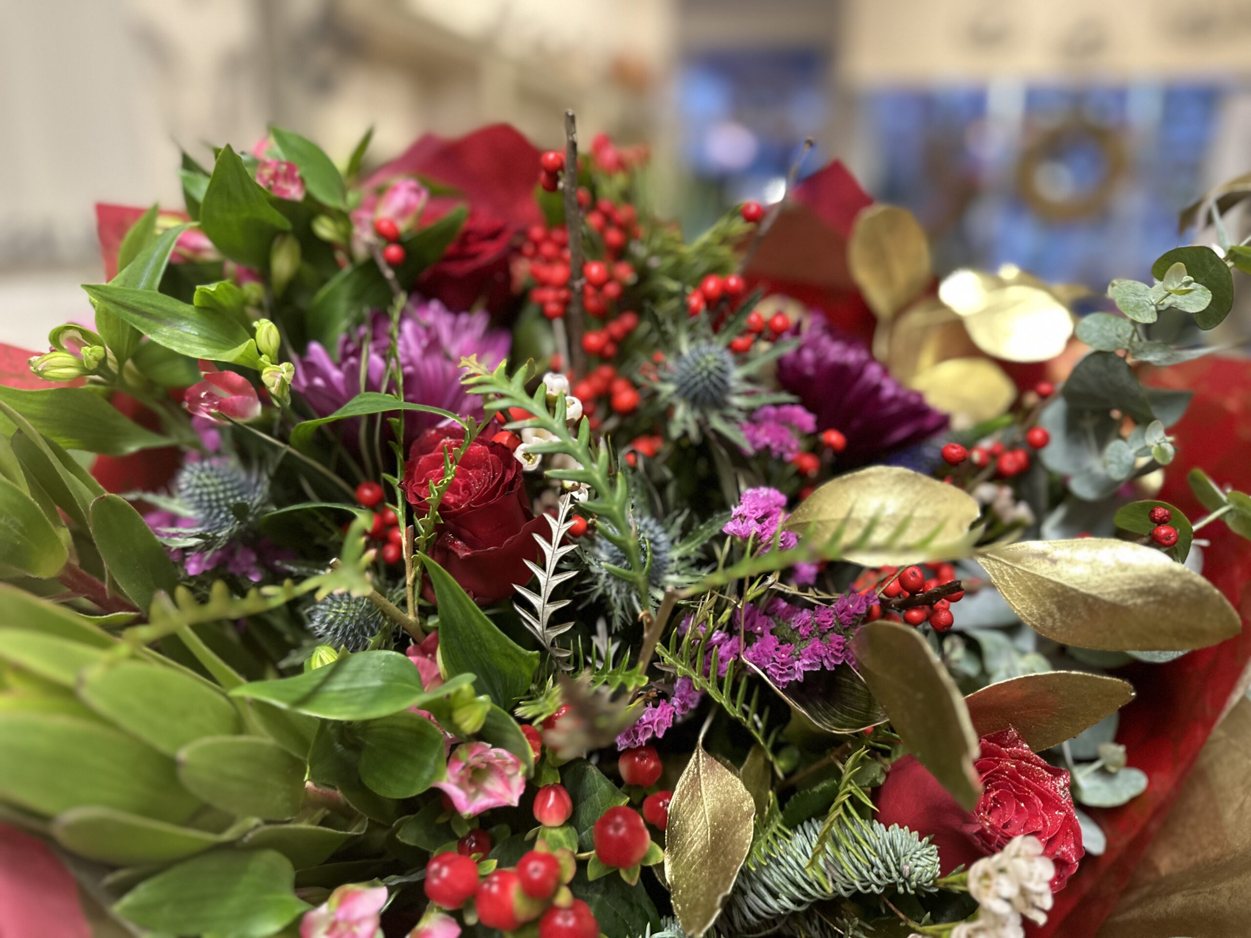 Inspired by the season, our Christmas Cheer Handtied Bouquets are expertly arranged by our trained florists using beautiful on trend festive foliage and florals, that tone right into the traditional colours of Christmas. Including a festive pick, Gold accents and a little bit of sparkle. Finished with complimenting gift wrap and a beautiful bow.